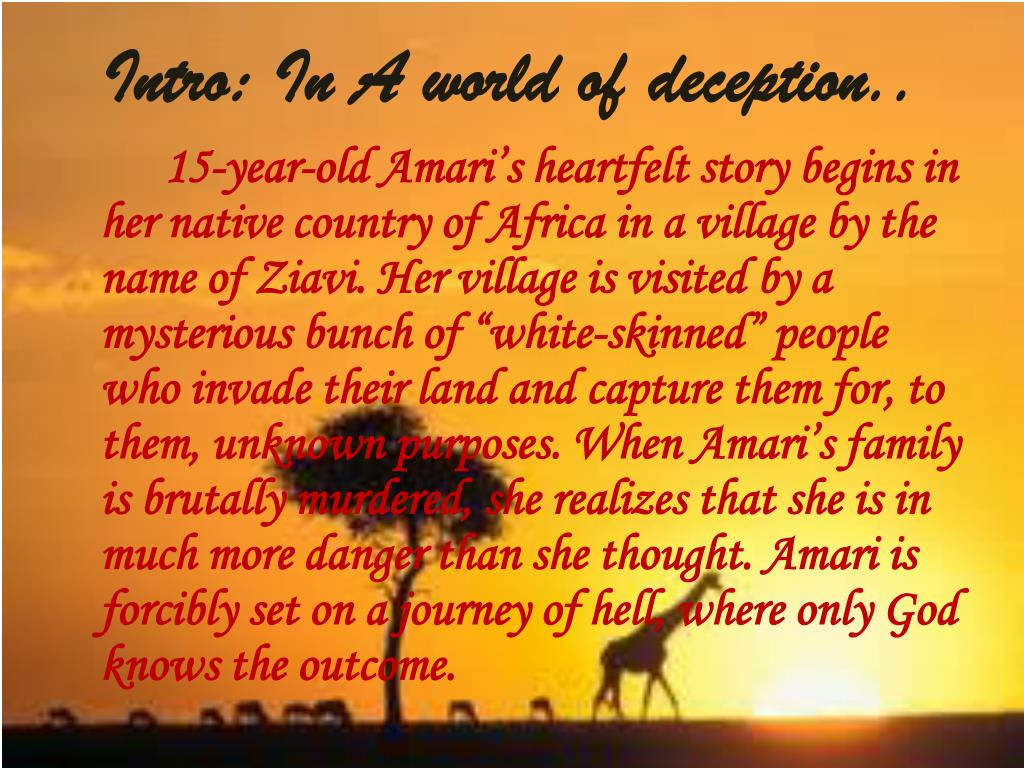 Intro: In A world of deception.. 15-year-old Amari’s heartfelt story begins in her native country of Africa in a village by the name of Ziavi. Her village is visited by a mysterious bunch of “white-skinned” people who invade their land and capture them for, to them, unknown purposes. When Amari’s family is brutally murdered, she realizes that she is in much more danger than she thought. Amari is forcibly set on a journey of hell, where only God knows the outcome.