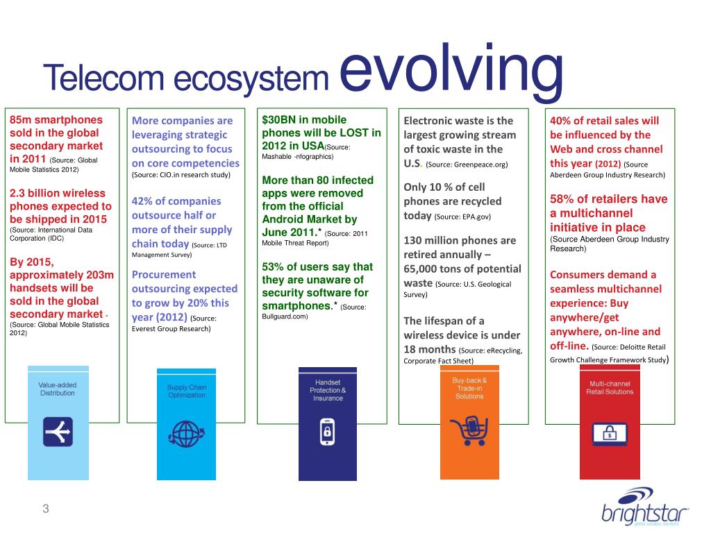 Telecom ecosystem evolving • $30BN in mobile phones will be LOST in 2012 in USA(Source: Mashable -nfographics) • More than 80 infected apps were removed from the official Android Market by June 2011.* (Source: 2011 Mobile Threat Report) • 53% of users say that they are unaware of security software for smartphones.* (Source: Bullguard.com) • 85m smartphones sold in the global secondary market in 2011(Source: Global Mobile Statistics 2012) • 2.3 billion wireless phones expected to be shipped in 2015 (Source: International Data Corporation (IDC) • By 2015, approximately 203m handsets will be sold in the global secondary market - (Source: Global Mobile Statistics 2012) • More companies are leveraging strategic outsourcing to focus on core competencies (Source: CIO.in research study) • 42% of companies outsource half or more of their supply chain today(Source: LTD Management Survey) • Procurement outsourcing expected to grow by 20% this year (2012) (Source: Everest Group Research) • Electronic waste is the largest growing stream of toxic waste in the U.S. (Source: Greenpeace.org) • Only 10 % of cell phones are recycled today (Source: EPA.gov) • 130 million phones are retired annually – 65,000 tons of potential waste(Source: U.S. Geological Survey) • The lifespan of a wireless device is under 18 months(Source: eRecycling, Corporate Fact Sheet) • 40% of retail sales will be influenced by the Web and cross channel this year (2012) (Source Aberdeen Group Industry Research) • 58% of retailers have a multichannel initiative in place (Source Aberdeen Group Industry Research) • Consumers demand a seamless multichannel experience: Buy anywhere/get anywhere, on-line and off-line. (Source: Deloitte Retail Growth Challenge Framework Study)