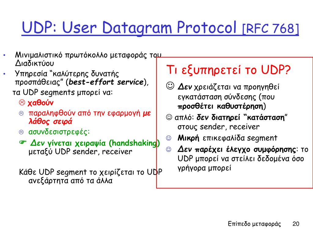 Μινιμαλιστικόπρωτόκολλο μεταφοράς του Διαδικτύου Υπηρεσία “καλύτερης δυνατής προσπάθειας” (best-effort service), τα UDP segments μπορεί να: χαθούν παραληφθούν από την εφαρμογή με λάθος σειρά ασυνδεσιστρεφές: Δεν γίνεταιχειραψία (handshaking)μεταξύ UDP sender, receiver Κάθε UDP segment το χειρίζεται το UDP ανεξάρτητα από τα άλλα Τι εξυπηρετεί το UDP? Δεν χρειάζεται να προηγηθεί εγκατάσταση σύνδεσης (που προσθέτει καθυστέρηση) απλό: δεν διατηρεί “κατάσταση” στους sender, receiver Μικρή επικεφαλίδα segment Δεν παρέχει έλεγχο συμφόρησης: το UDP μπορεί να στείλει δεδομένα όσο γρήγορα μπορεί UDP: User Datagram Protocol [RFC 768] Επίπεδο μεταφοράς
