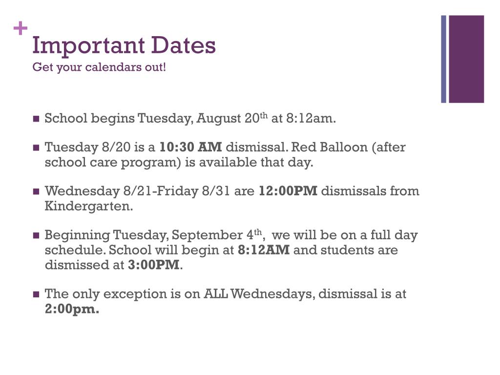 Important DatesGet your calendars out! • School begins Tuesday, August 20th at 8:12am. • Tuesday 8/20 is a 10:30 AM dismissal. Red Balloon (after school care program) is available that day. • Wednesday 8/21-Friday 8/31 are 12:00PM dismissals from Kindergarten. • Beginning Tuesday, September 4th, we will be on a full day schedule. School will begin at 8:12AM and students are dismissed at 3:00PM. • The only exception is on ALL Wednesdays, dismissal is at 2:00pm.
