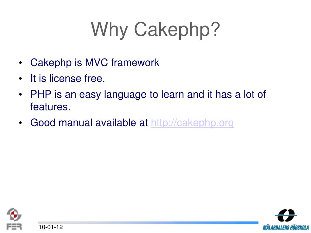 Why Cakephp? • Cakephp is MVC framework • It is license free. • PHP is an easy language to learn and it has a lot of features. • Good manual available at http://cakephp.org