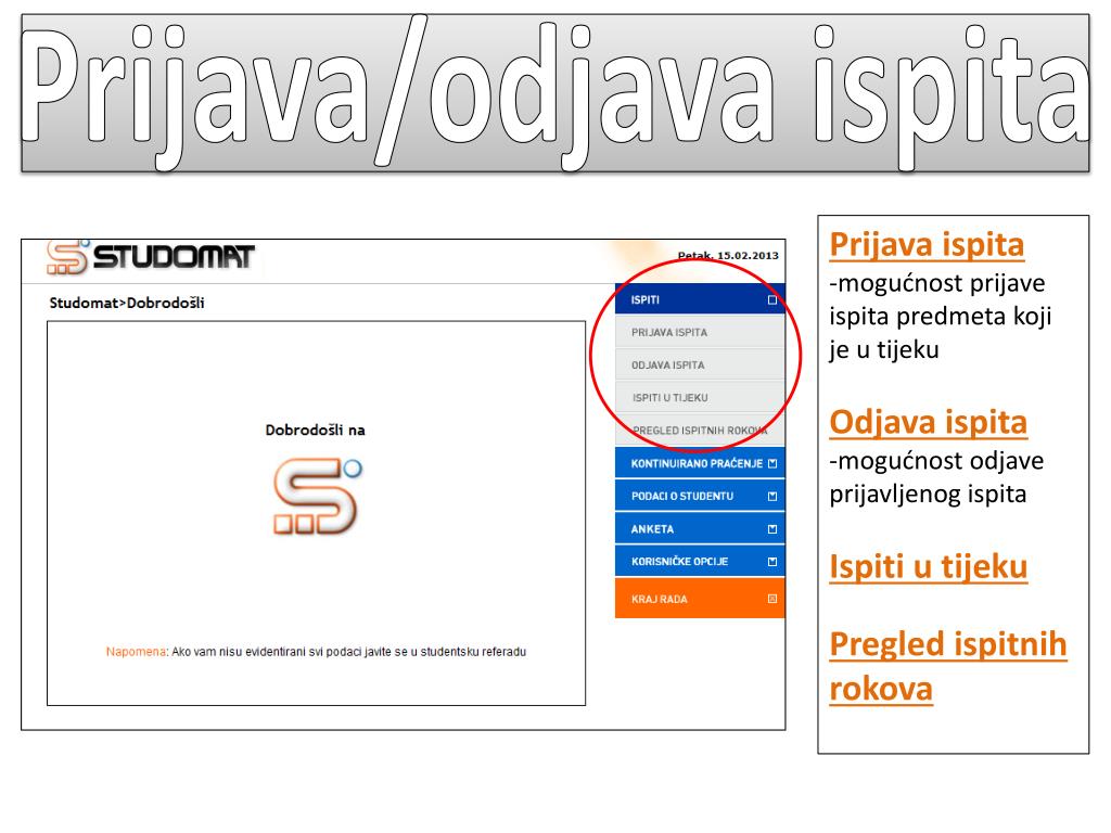 Prijava/odjava ispita Prijava ispita -mogućnost prijave ispita predmeta koji je u tijeku Odjava ispita -mogućnost odjave prijavljenog ispita Ispiti u tijeku Pregled ispitnih rokova