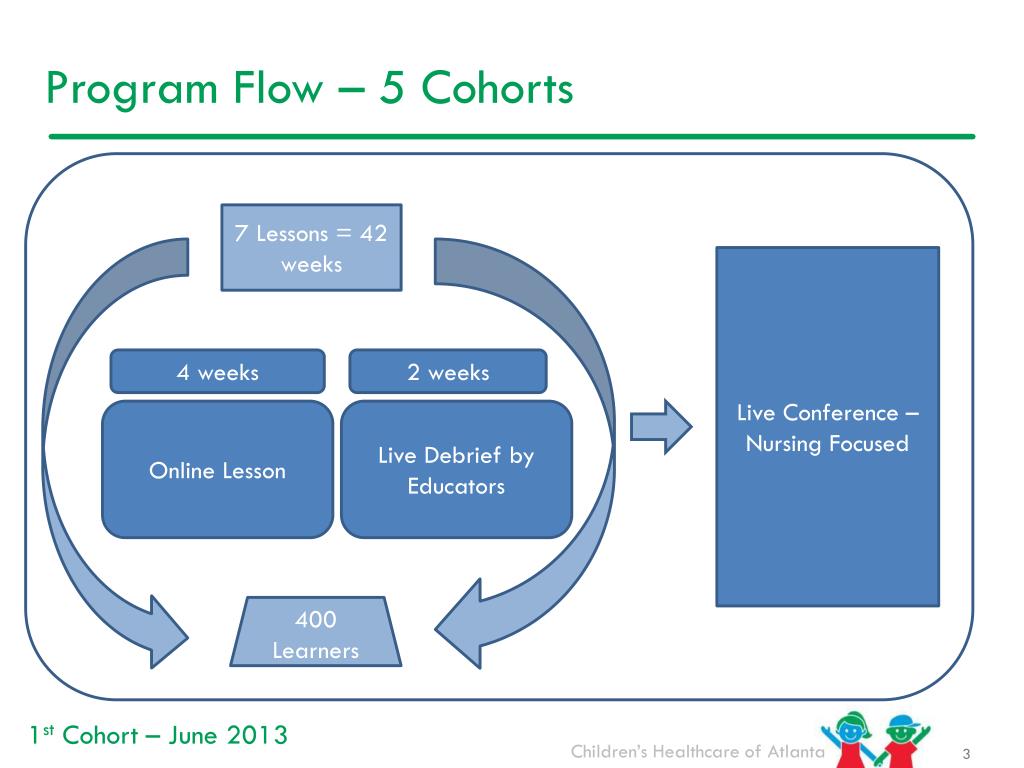 Program Flow – 5 Cohorts 7 Lessons = 42 weeks Live Conference – Nursing Focused 4 weeks 2 weeks Online Lesson Live Debrief by Educators 400 Learners 1st Cohort – June 2013