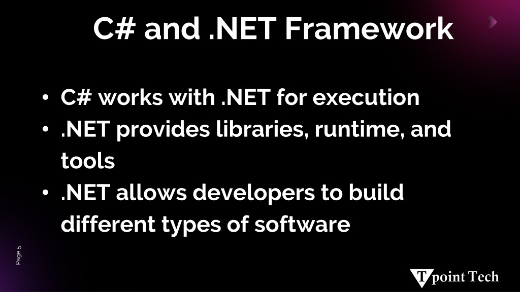 Key Features of C# • Object-oriented • Strongly typed language • Automatic memory management (Garbage Collection) • Large standard library • Cross-platform development support Page 4