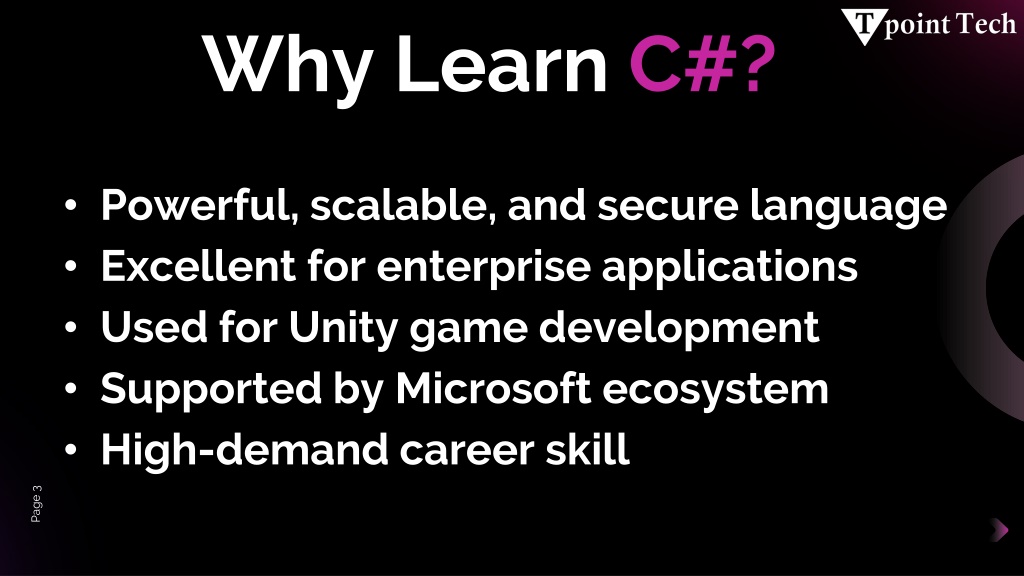 Why Learn C#? • Powerful, scalable, and secure language • Excellent for enterprise applications • Used for Unity game development • Supported by Microsoft ecosystem • High-demand career skill Page 3
