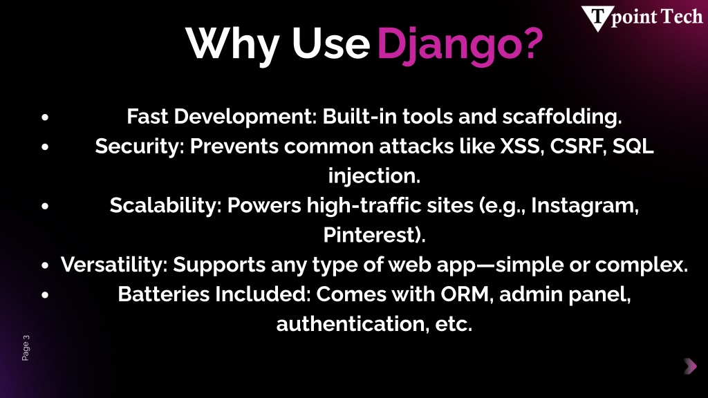 Why UseDjango? Fast Development: Built-in tools and scaffolding. Security: Prevents common attacks like XSS, CSRF, SQL injection. Scalability: Powers high-traffic sites (e.g., Instagram, Pinterest). Versatility: Supports any type of web app—simple or complex. Batteries Included: Comes with ORM, admin panel, authentication, etc. Page 3