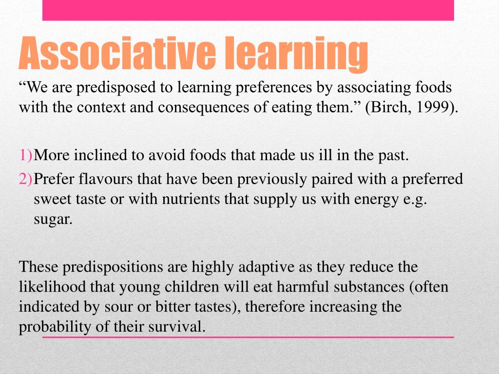 “We are predisposed to learning preferences by associating foods with the context and consequences of eating them.” (Birch, 1999). • More inclined to avoid foods that made us ill in the past. • Prefer flavours that have been previously paired with a preferred sweet taste or with nutrients that supply us with energy e.g. sugar. These predispositions are highly adaptive as they reduce the likelihood that young children will eat harmful substances (often indicated by sour or bitter tastes), therefore increasing the probability of their survival. Associative learning