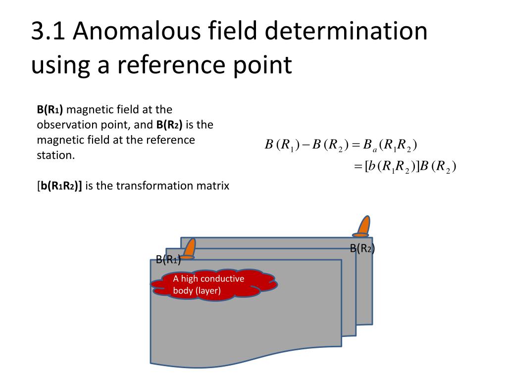 3.1 Anomalous field determination using a reference point B(R1) magnetic field at the observation point, and B(R2) is the magnetic field at the reference station. [b(R1R2)] is the transformation matrix B(R2) B(R1) A high conductive body (layer)