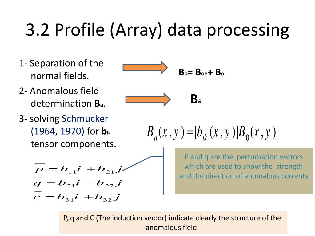 3.2 Profile (Array) data processing 1- Separation of the normal fields. 2- Anomalous field determination Ba. 3- solving Schmucker (1964, 1970) for bik tensor components. Bo= Boe+ Boi Ba P and q are the perturbation vectors which are used to show the strength and the direction of anomalous currents P, q and C (The induction vector) indicate clearly the structure of the anomalous field