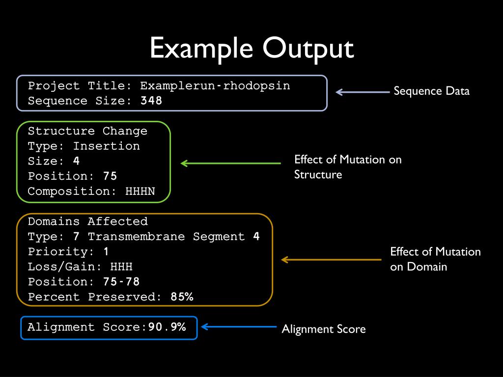 Example Output Project Title: Examplerun-rhodopsin Sequence Size: 348 Structure Change Type: Insertion Size: 4 Position: 75 Composition: HHHN Domains Affected Type: 7 Transmembrane Segment 4 Priority: 1 Loss/Gain: HHH Position: 75-78 Percent Preserved: 85% Alignment Score:90.9% Sequence Data Effect of Mutation on Structure Effect of Mutation on Domain Alignment Score