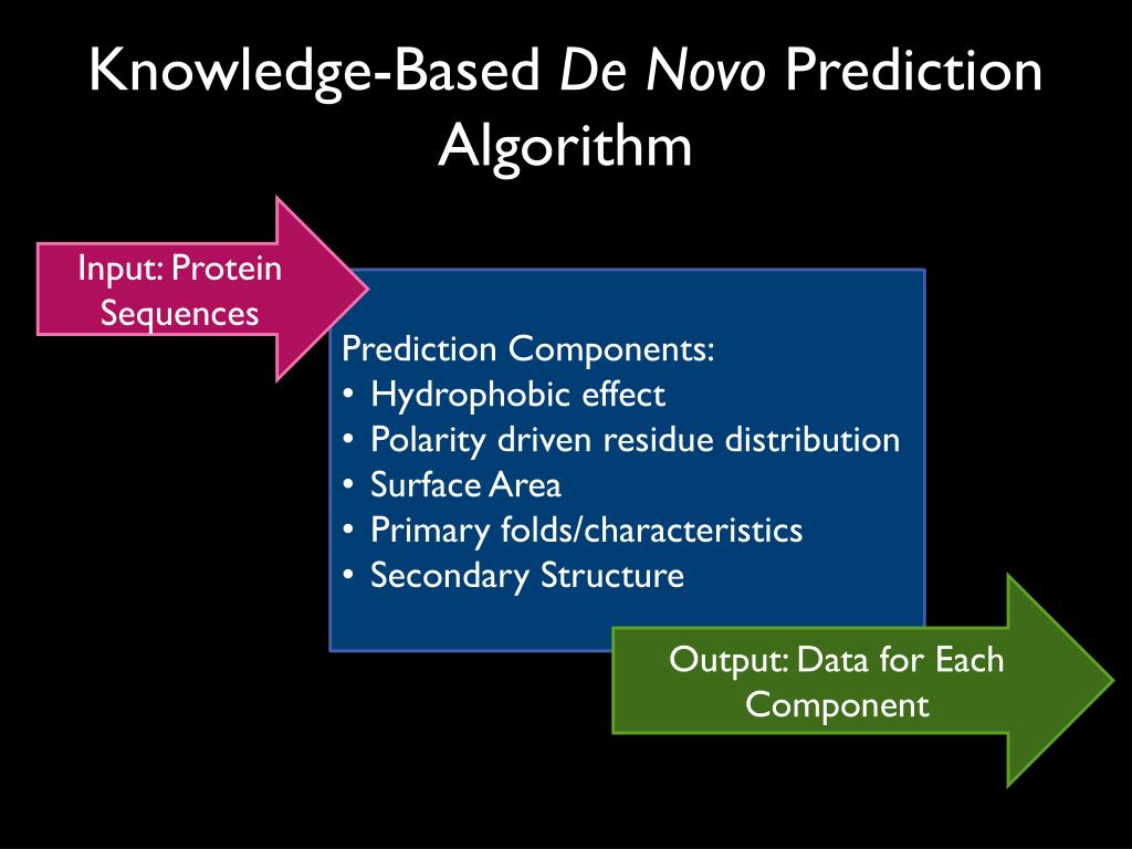 Knowledge-Based De Novo Prediction Algorithm Input: Protein Sequences • Prediction Components: • Hydrophobic effect • Polarity driven residue distribution • Surface Area • Primary folds/characteristics • Secondary Structure Output: Data for Each Component