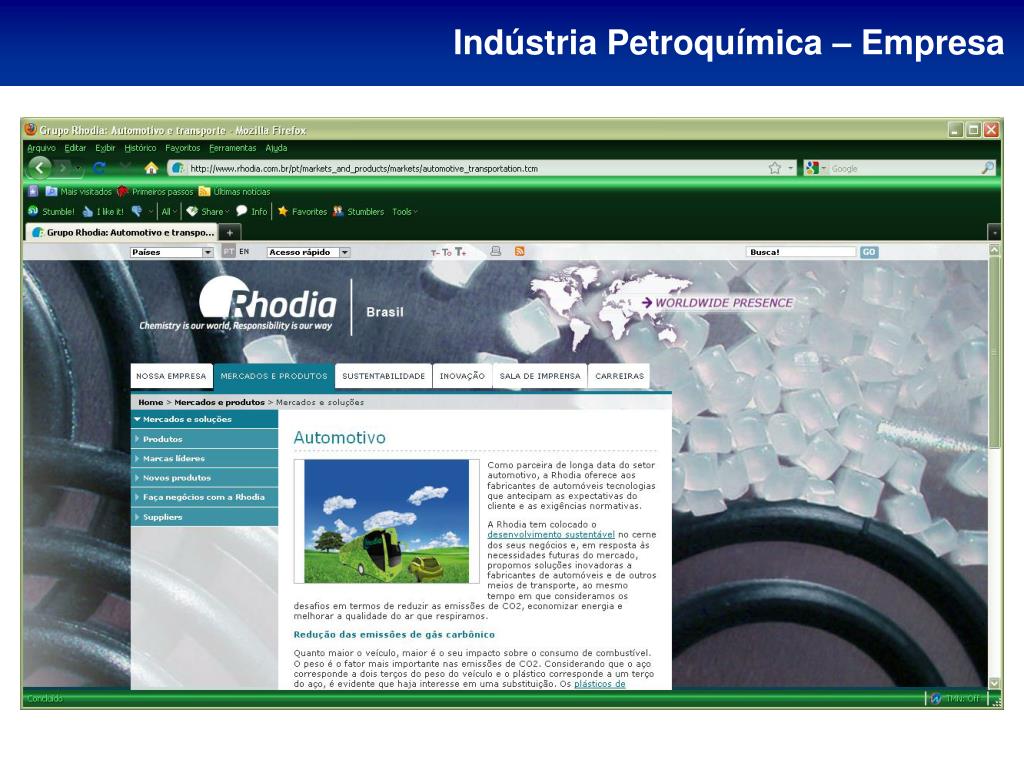 Indústria Petroquímica – Cadeia de Valor Exploração Refino 1ª Geração 2ª Geração 3ª Geração / Uso Olefinas Eteno Propeno Butadieno Aromáticos Benzeno Tolueno Xilenos Polietilenos Polipropilenos Estireno Ác. Acético Fenol Acrilonitrila Etanol ... Embalagens (PE, PET) Construção Civil (PVC) Autopeças (PA, PP, ABS) Eletro- eltrônicos (PS) Têxteis (PA, PET) ... Gás Natural Petróleo Nafta Diesel Gasolina Querosene GLP Alcatrão Parafina ... Indústria Petroquímica Indústria do Petróleo Fontes: ABIQUIM; APPE.