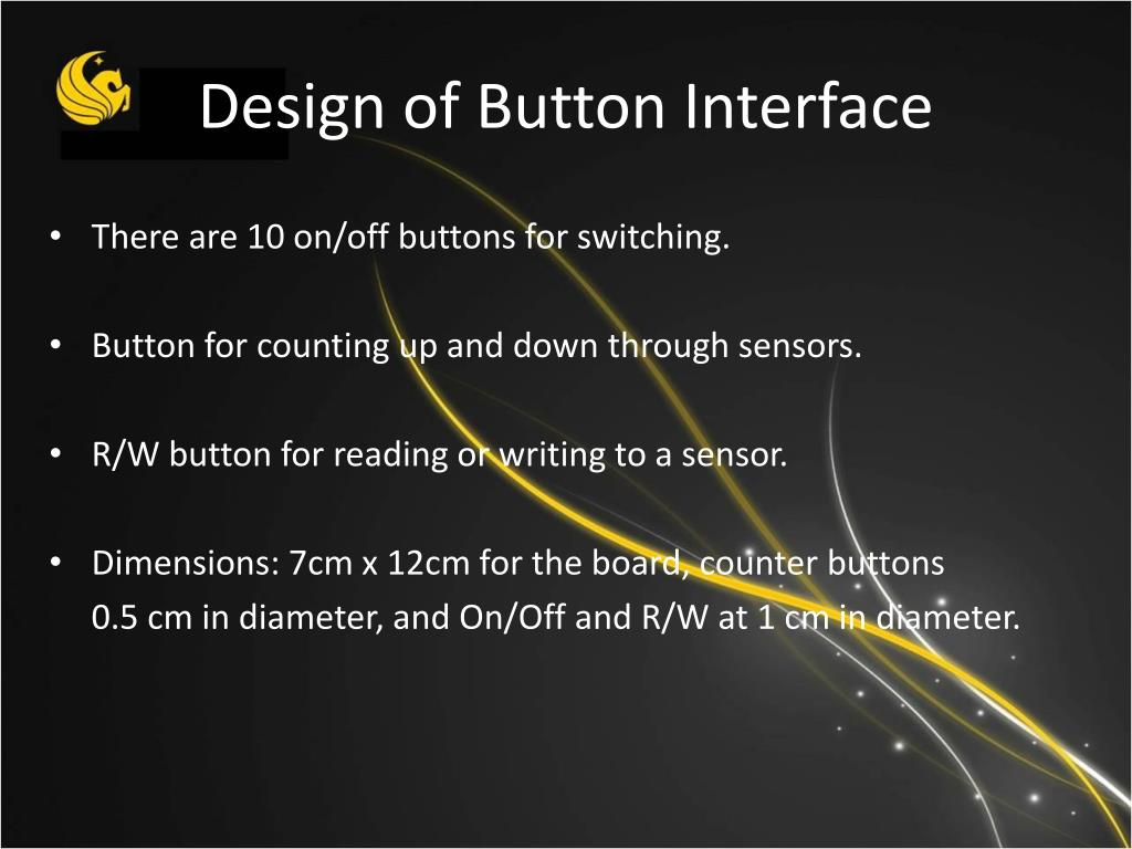 Design of Button Interface • There are 10 on/off buttons for switching. • Button for counting up and down through sensors. • R/W button for reading or writing to a sensor. • Dimensions: 7cm x 12cm for the board, counter buttons 0.5 cm in diameter, and On/Off and R/W at 1 cm in diameter.
