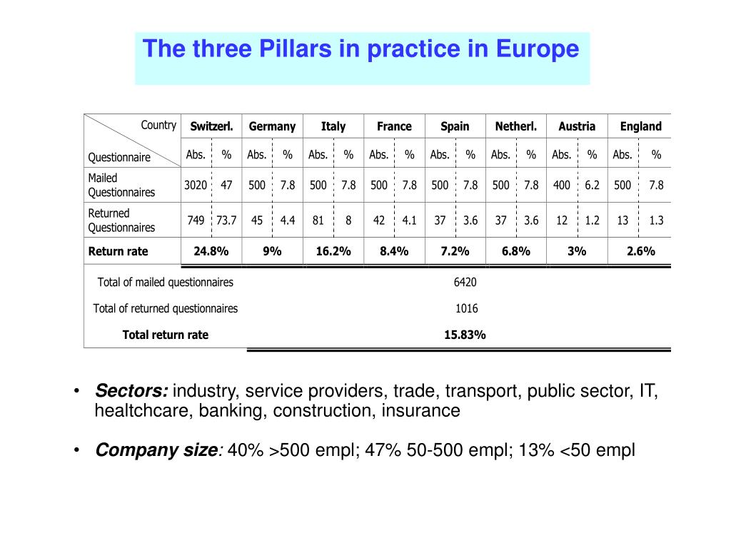 The three Pillars in practice in Europe • Sectors:industry, service providers, trade, transport, public sector, IT, healtchcare, banking, construction, insurance • Company size: 40% >500 empl; 47% 50-500 empl; 13% <50 empl