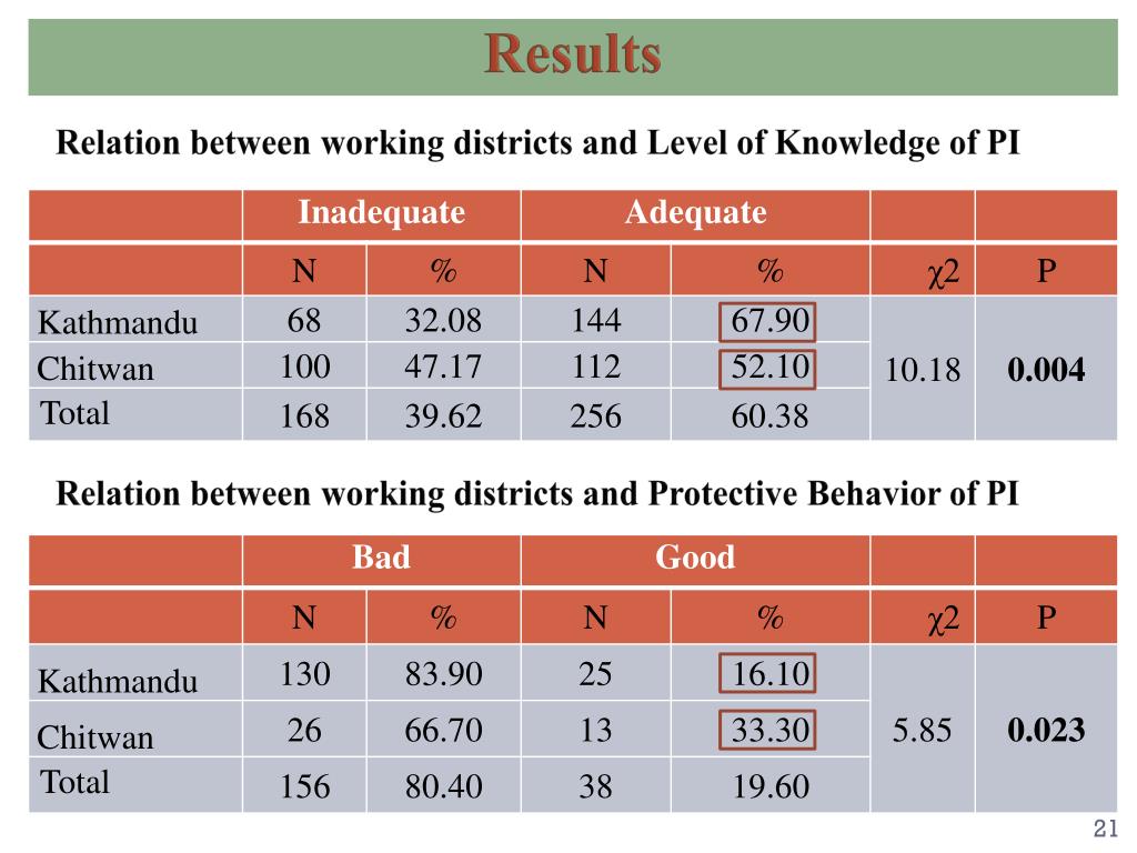 Results Relation between working districts and Level of Knowledge of PI Relation between working districts and Protective Behaviorof PI Relation between working districts and protective Behavior