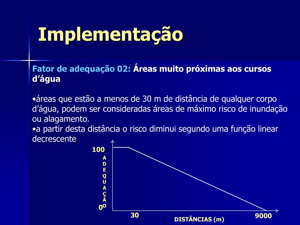 100 A D E Q U A Ç Ã O 0 30 9000 DISTÂNCIAS (m) Implementação • Fator de adequação 02: Áreas muito próximas aos cursos d’água • áreas que estão a menos de 30 m de distância de qualquer corpo d’água, podem ser consideradas áreas de máximo risco de inundação ou alagamento. • a partir desta distância o risco diminui segundo uma função linear decrescente