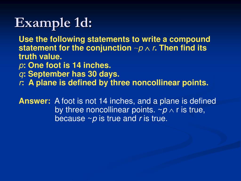 Example 1a: Use the following statements to write a compound statement for the conjunction p and q. Then find its truth value.p: One foot is 14 inches.q: September has 30 days.r: A plane is defined by three noncollinear points. Answer: One foot is 14 inches, and September has 30 days. p and q is false, because p is false and q is true.