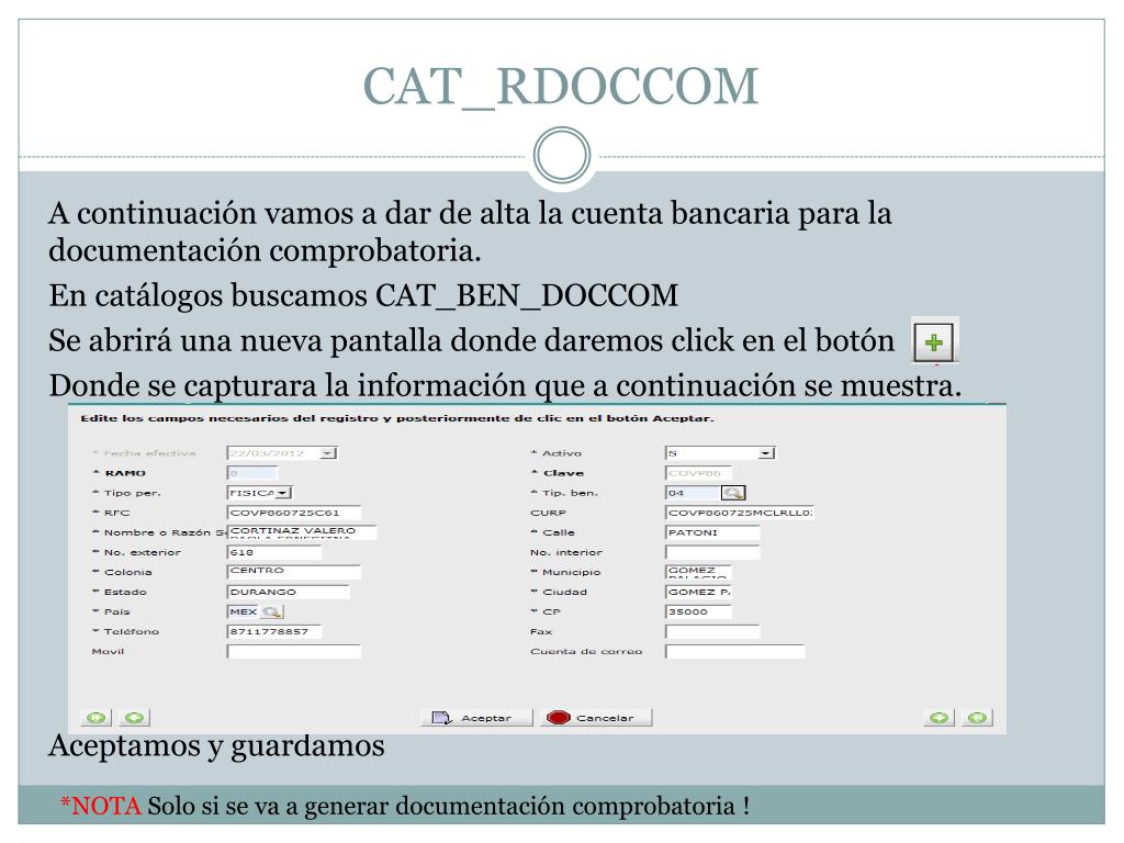 CAT_RDOCCOM A continuación vamos enlasarroles y beneficiarios de la documentacion. En catálogos buscamos CAT_RDOCCOM Se abrirá una nueva pantalla donde daremos click en el botón Donde se capturara la información que a continuación se muestra. Aceptamos y guardamos *NOTA Solo si se va a generar documentación comprobatoria !