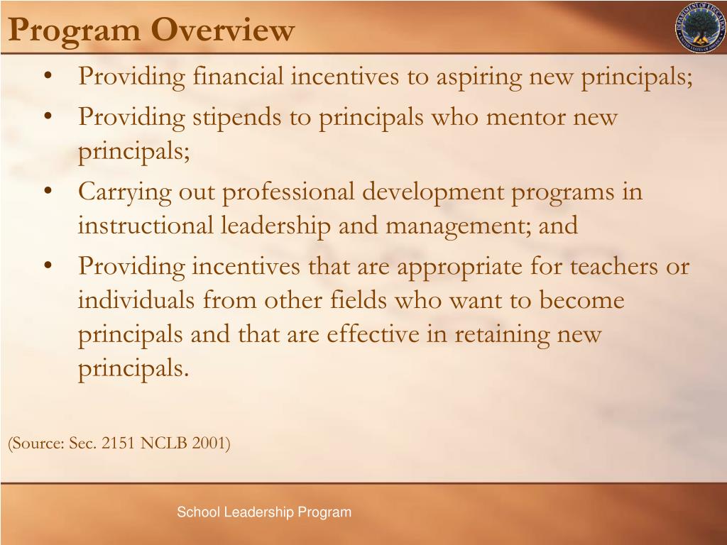 Program Overview • Providing financial incentives to aspiring new principals; • Providing stipends to principals who mentor new principals; • Carrying out professional development programs in instructional leadership and management; and • Providing incentives that are appropriate for teachers or individuals from other fields who want to become principals and that are effective in retaining new principals. (Source: Sec. 2151 NCLB 2001)