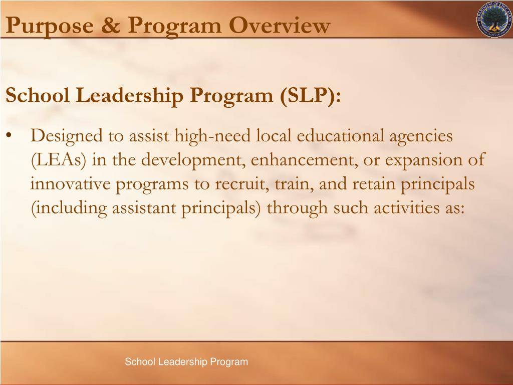 Purpose & Program Overview School Leadership Program (SLP): • Designed to assist high-need local educational agencies (LEAs) in the development, enhancement, or expansion of innovative programs to recruit, train, and retain principals (including assistant principals) through such activities as: