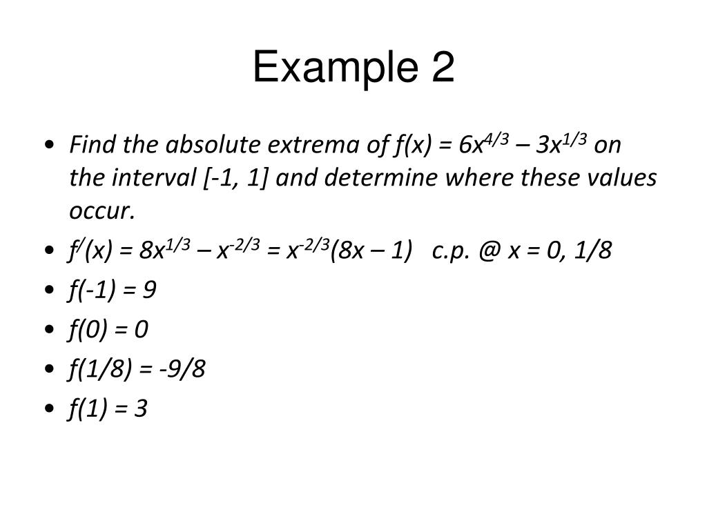 Example 2 • Find the absolute extrema of f(x) = 6x4/3 – 3x1/3 on the interval [-1, 1] and determine where these values occur. • f/(x) = 8x1/3 – x-2/3 = x-2/3(8x – 1) c.p. @ x = 0, 1/8