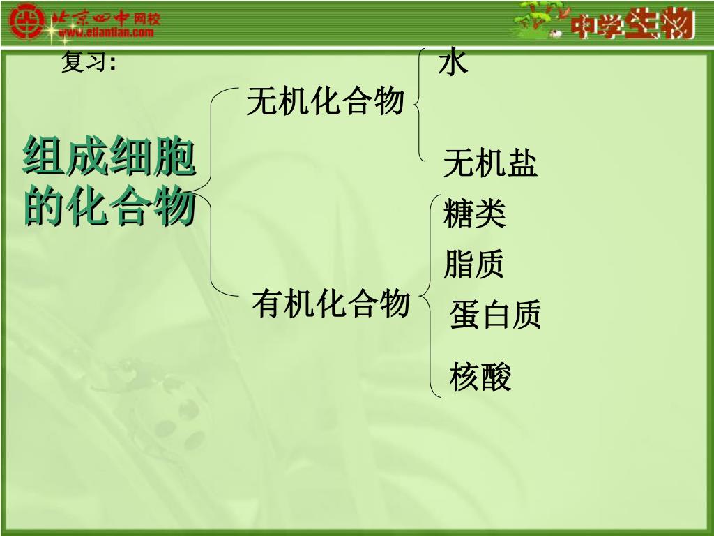 水 复习: 无机化合物 组成细胞的化合物 无机盐 糖类 脂质 有机化合物 蛋白质 核酸