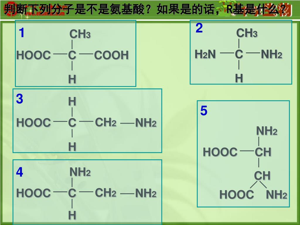 判断下列分子是不是氨基酸?如果是的话,R基是什么?判断下列分子是不是氨基酸?如果是的话,R基是什么? 2 1 CH3 CH3 H2N C NH2 HOOC C COOH H H 3 H 5 CH2 HOOC C NH2 NH2 H HOOC CH 4 NH2 CH CH2 HOOC C NH2 HOOC NH2 H