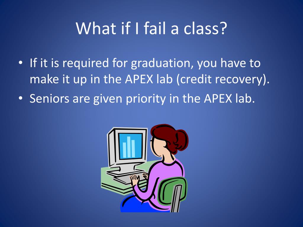 What if I fail a class? • If it is required for graduation, you have to make it up in the APEX lab (credit recovery). • Seniors are given priority in the APEX lab.