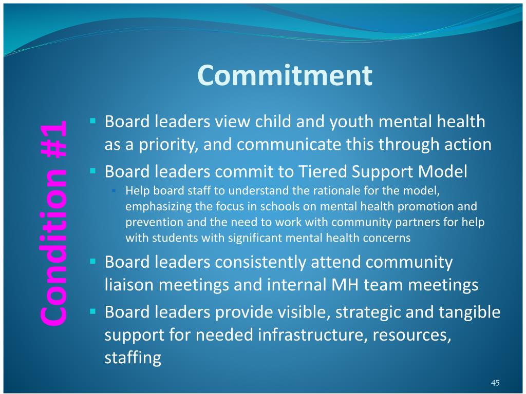 Commitment Condition #1 • Board leaders view child and youth mental health as a priority, and communicate this through action • Board leaders commit to Tiered Support Model • Help board staff to understand the rationale for the model, emphasizing the focus in schools on mental health promotion and prevention and the need to work with community partners for help with students with significant mental health concerns • Board leaders consistently attend community liaison meetings and internal MH team meetings • Board leaders provide visible, strategic and tangible support for needed infrastructure, resources, staffing