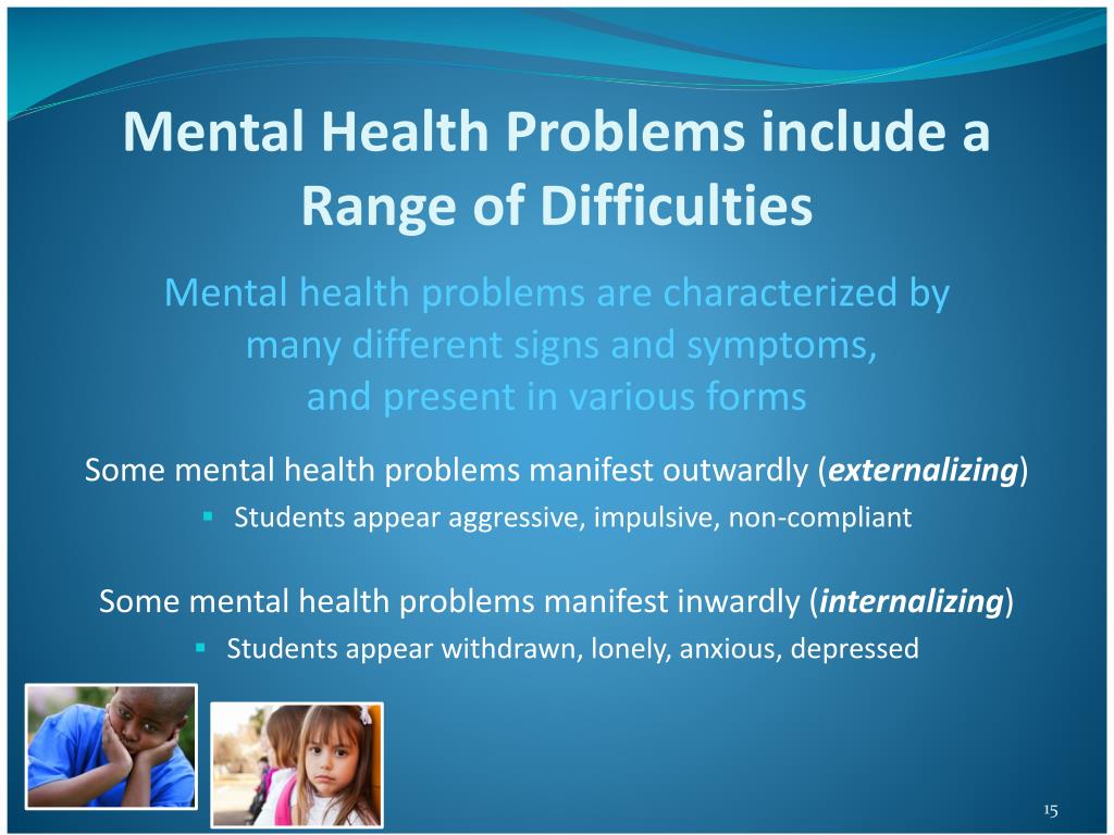 Mental Health Problems include a Range of Difficulties Mental health problems are characterized by many different signs and symptoms, and present in various forms Some mental health problems manifest outwardly (externalizing) • Students appear aggressive, impulsive, non-compliant Some mental health problems manifest inwardly (internalizing) • Students appear withdrawn, lonely, anxious, depressed