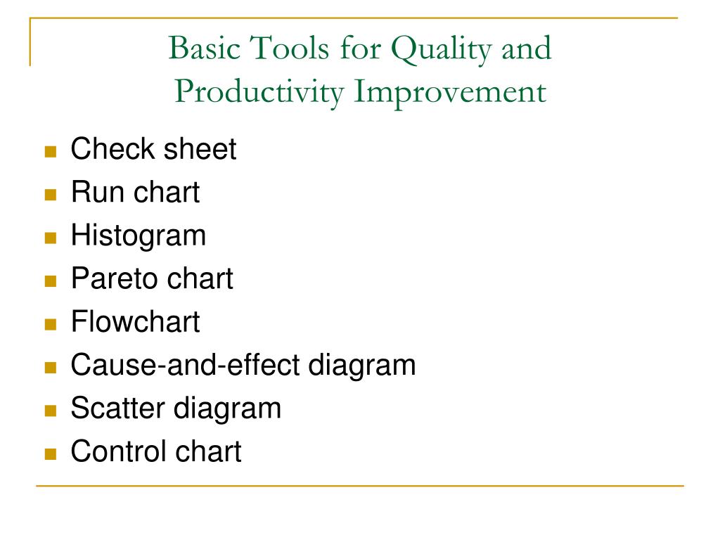 Basic Tools for Quality andProductivity Improvement • Check sheet • Run chart • Histogram • Pareto chart • Flowchart • Cause-and-effect diagram • Scatter diagram • Control chart