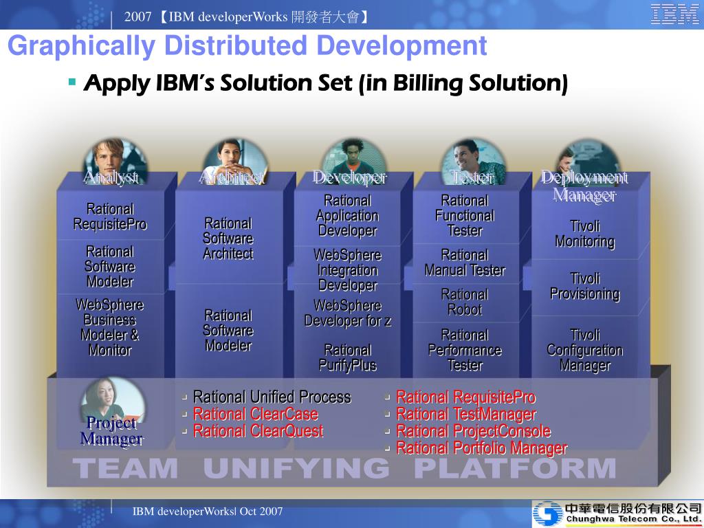Graphically Distributed Development • Apply IBM’s Solution Set (in Billing Solution) Analyst Architect Developer Tester Deployment Manager Rational Application Developer Rational Functional Tester Rational RequisitePro Rational Software Architect Tivoli Monitoring Rational Software Modeler WebSphere Integration Developer RationalManual Tester Tivoli Provisioning Rational Robot WebSphere Business Modeler & Monitor WebSphere Developer for z Rational Software Modeler Rational Performance Tester Tivoli Configuration Manager Rational PurifyPlus • Rational Unified Process • Rational ClearCase • Rational ClearQuest • Rational RequisitePro • Rational TestManager • Rational ProjectConsole • Rational Portfolio Manager Project Manager TEAM UNIFYING PLATFORM