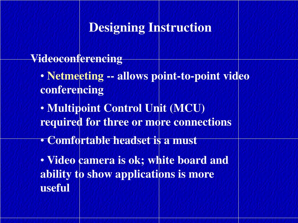 Designing Instruction Videoconferencing • Netmeeting -- allows point-to-point video conferencing • Multipoint Control Unit (MCU) required for three or more connections • Comfortable headset is a must • Video camera is ok; white board and ability to show applications is more useful