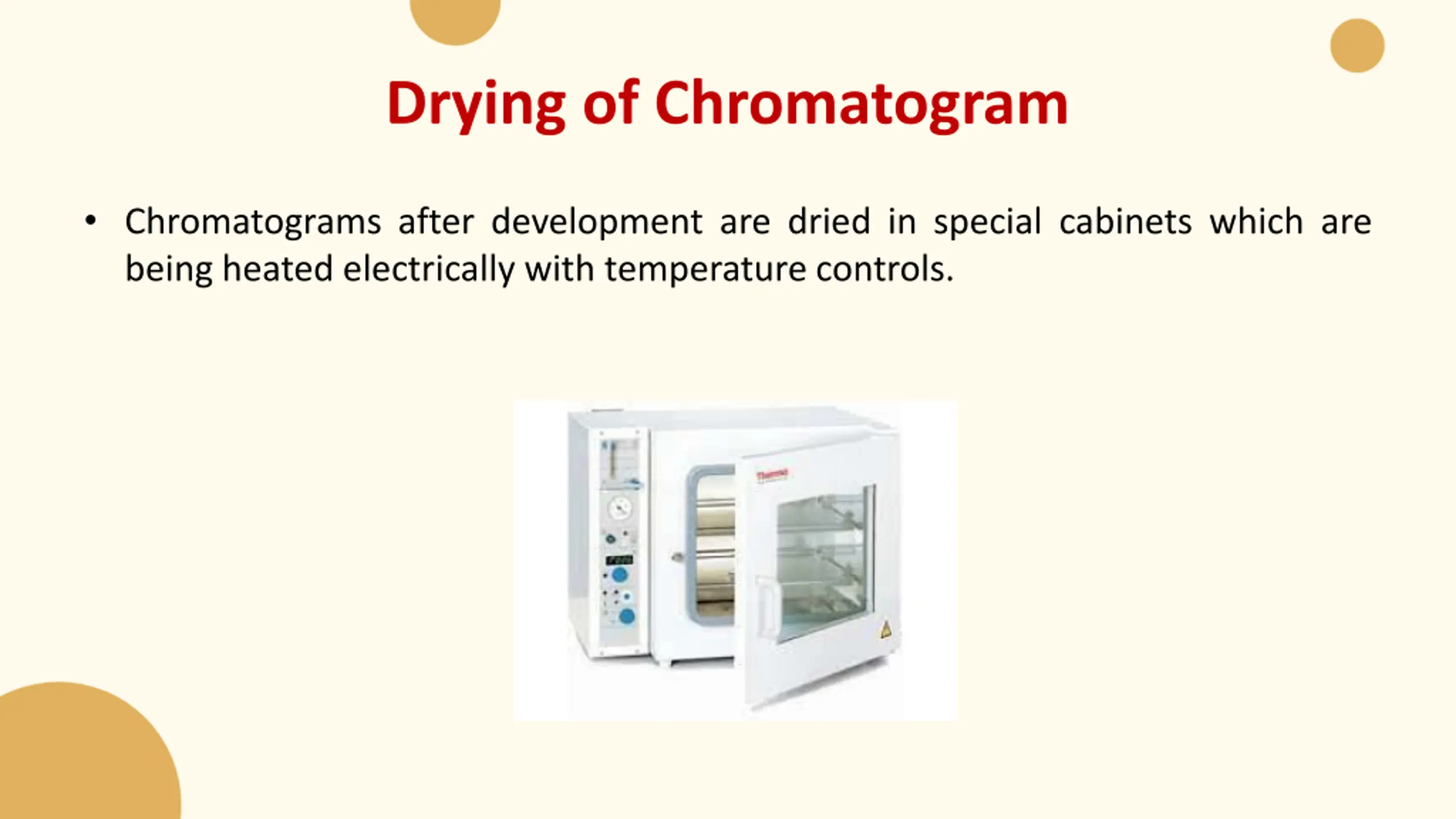 Drying of Chromatogram • Chromatograms after development are dried in special cabinets which are being heated electrically with temperature controls.