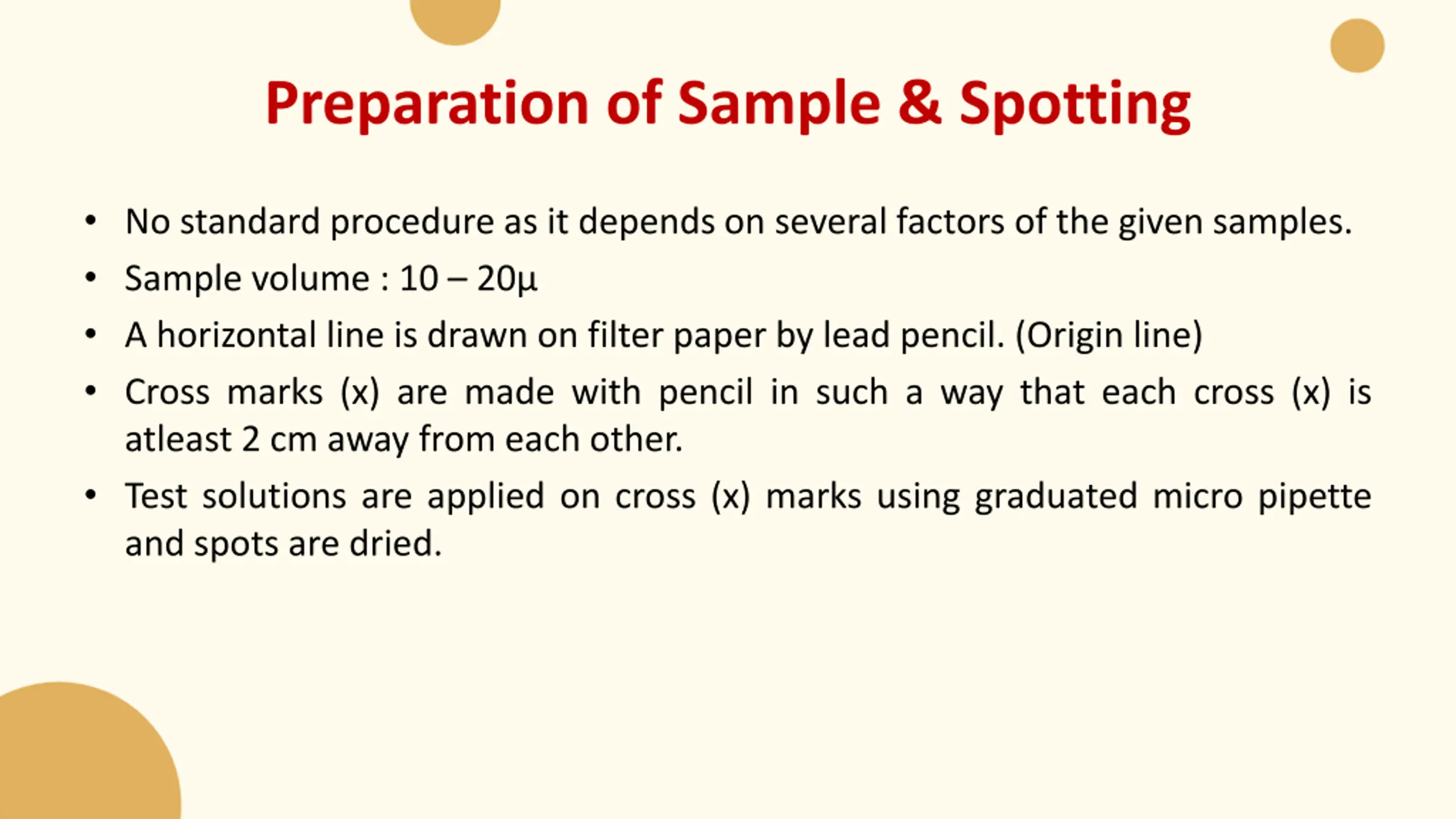 Preparation of Sample & Spotting • No standard procedure as it depends on several factors of the given samples. • Sample volume : 10 – 20µ • A horizontal line is drawn on filter paper by lead pencil. (Origin line) • Cross marks (x) are made with pencil in such a way that each cross (x) is atleast 2 cm away from each other. • Test solutions are applied on cross (x) marks using graduated micro pipette and spots are dried.