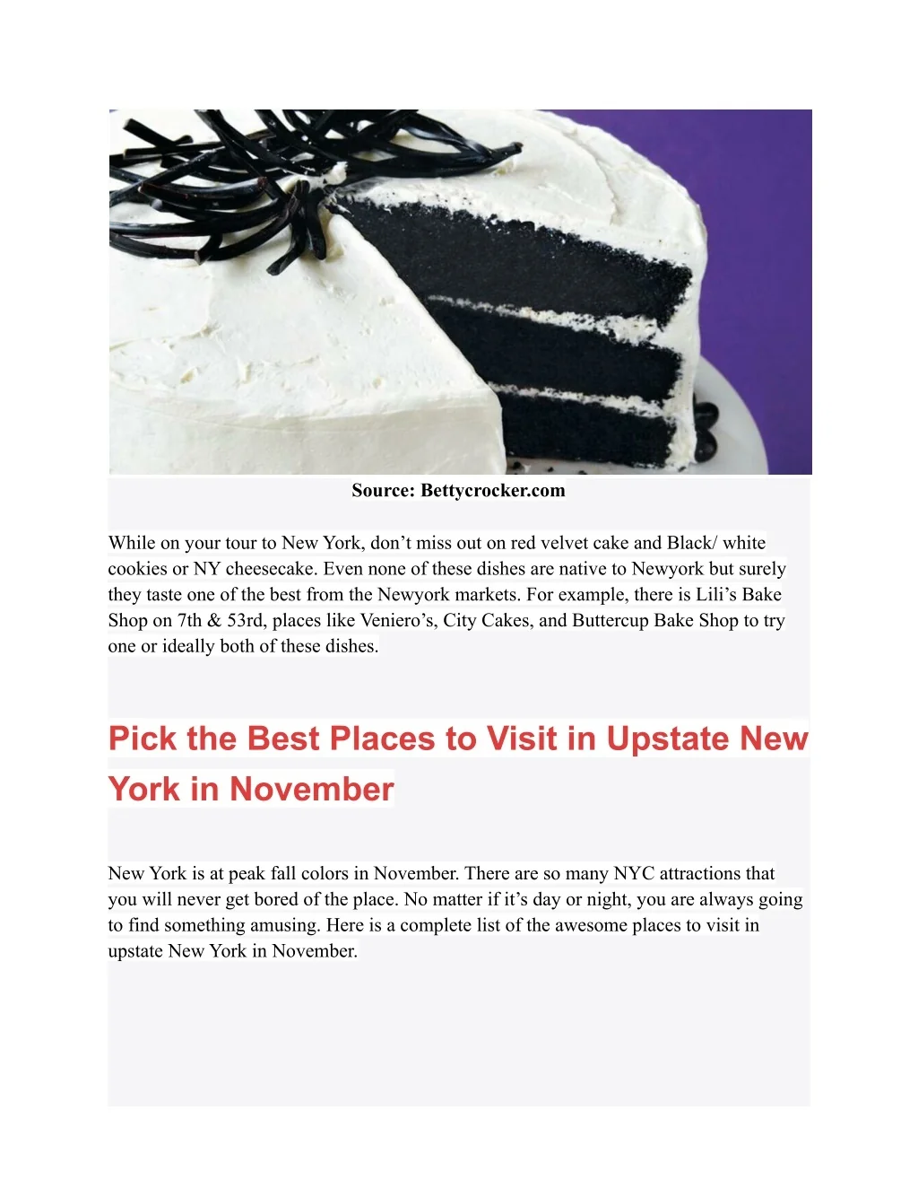Source: Bettycrocker.com While on your tour to New York, don’t miss out on red velvet cake and Black/ white cookies or NY cheesecake. Even none of these dishes are native to Newyork but surely they taste one of the best from the Newyork markets. For example, there is Lili’s Bake Shop on 7th & 53rd, places like Veniero’s, City Cakes, and Buttercup Bake Shop to try one or ideally both of these dishes. Pick the Best Places to Visit in Upstate New York in November New York is at peak fall colors in November. There are so many NYC attractions that you will never get bored of the place. No matter if it’s day or night, you are always going to find something amusing. Here is a complete list of the awesome places to visit in upstate New York in November.