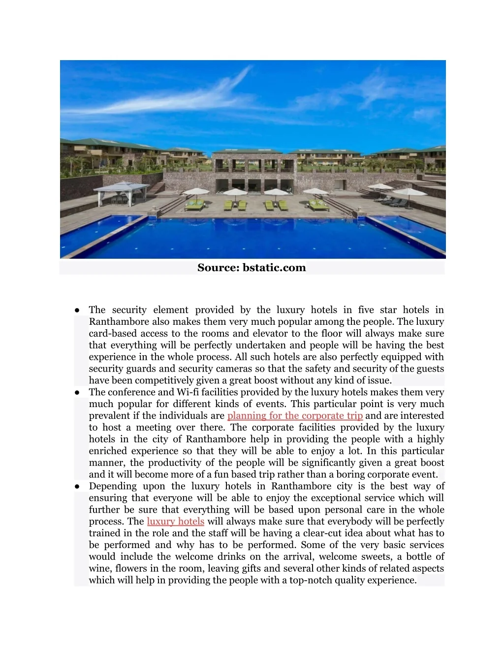 Source: bstatic.com ● The security element provided by the luxury hotels in five star hotels in Ranthambore also makes them very much popular among the people. The luxury card-based access to the rooms and elevator to the floor will always make sure that everything will be perfectly undertaken and people will be having the best experience in the whole process. All such hotels are also perfectly equipped with security guards and security cameras so that the safety and security of the guests have been competitively given a great boost without any kind of issue. ● The conference and Wi-fi facilities provided by the luxury hotels makes them very much popular for different kinds of events. This particular point is very much prevalent if the individuals are planning for the corporate trip and are interested to host a meeting over there. The corporate facilities provided by the luxury hotels in the city of Ranthambore help in providing the people with a highly enriched experience so that they will be able to enjoy a lot. In this particular manner, the productivity of the people will be significantly given a great boost and it will become more of a fun based trip rather than a boring corporate event. ● Depending upon the luxury hotels in Ranthambore city is the best way of ensuring that everyone will be able to enjoy the exceptional service which will further be sure that everything will be based upon personal care in the whole process. The luxury hotels will always make sure that everybody will be perfectly trained in the role and the staff will be having a clear-cut idea about what has to be performed and why has to be performed. Some of the very basic services would include the welcome drinks on the arrival, welcome sweets, a bottle of wine, flowers in the room, leaving gifts and several other kinds of related aspects which will help in providing the people with a top-notch quality experience.