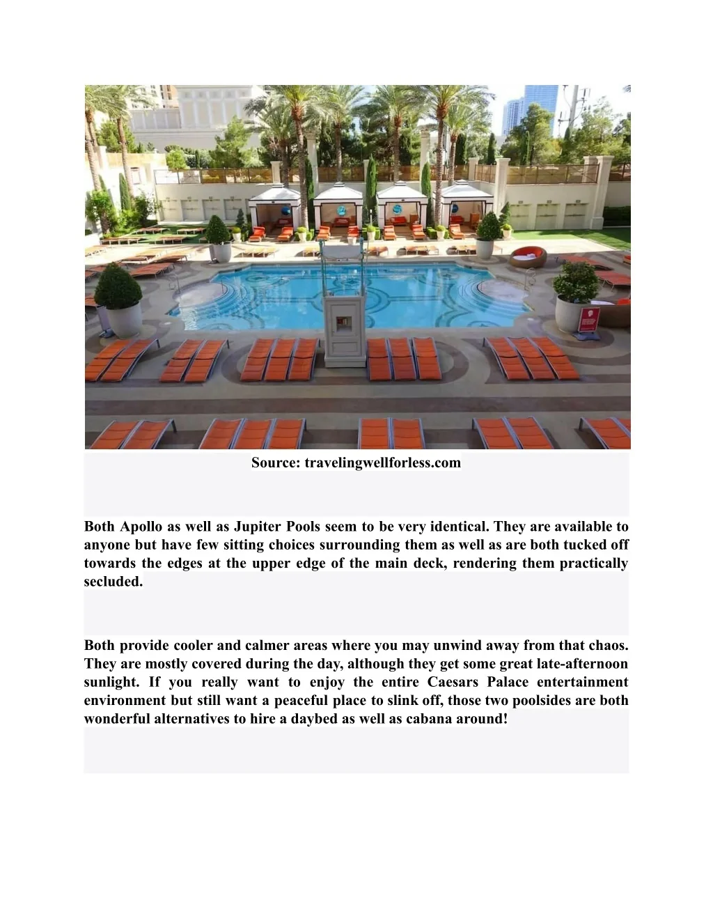 Source: travelingwellforless.com Both Apollo as well as Jupiter Pools seem to be very identical. They are available to anyone but have few sitting choices surrounding them as well as are both tucked off towards the edges at the upper edge of the main deck, rendering them practically secluded. Both provide cooler and calmer areas where you may unwind away from that chaos. They are mostly covered during the day, although they get some great late-afternoon sunlight. If you really want to enjoy the entire Caesars Palace entertainment environment but still want a peaceful place to slink off, those two poolsides are both wonderful alternatives to hire a daybed as well as cabana around!