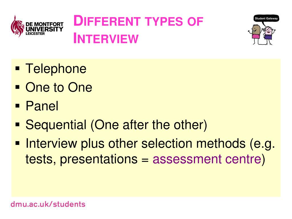 Different types of Interview • Telephone • One to One • Panel • Sequential (One after the other) • Interview plus other selection methods (e.g. tests, presentations = assessment centre)