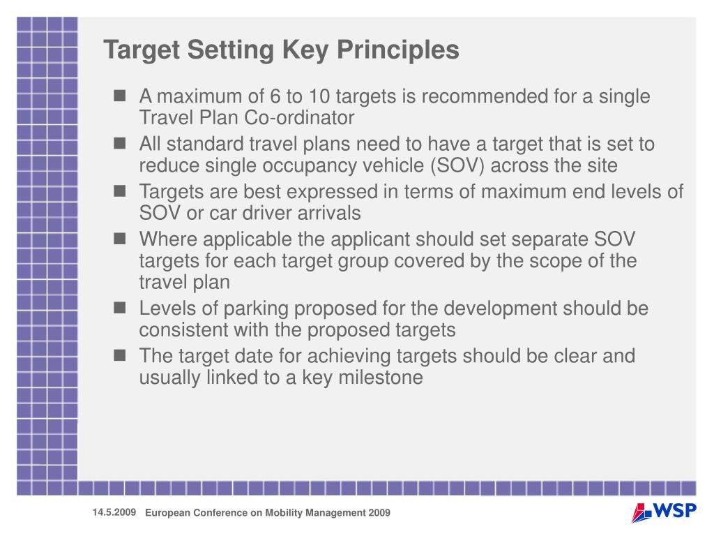 Target Setting Key Principles • A maximum of 6 to 10 targets is recommended for a single Travel Plan Co-ordinator • All standard travel plans need to have a target that is set to reduce single occupancy vehicle (SOV) across the site • Targets are best expressed in terms of maximum end levels of SOV or car driver arrivals • Where applicable the applicant should set separate SOV targets for each target group covered by the scope of the travel plan • Levels of parking proposed for the development should be consistent with the proposed targets • The target date for achieving targets should be clear and usually linked to a key milestone European Conference on Mobility Management 2009