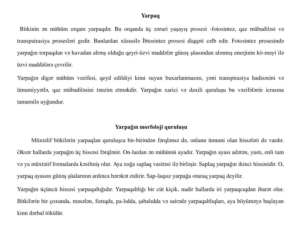 Yarpaq Bitkinin ən mühüm orqanı yarpaqdır. Bu orqanda üç zəruri yaşayış prosesi -fotosintez, qaz mübadiləsi və transpairasiya prosesləri gedir. Bunlardan xüsusilə İbtosintez prosesi diqqəti cəlb edir. Fotosintez prosesində yarpağın torpaqdan və havadan alrmş olduğu qeyri-üzvi maddələr günəş şüasından alınmış enerjinin kö-məyi ilə üzvi maddələrə çevrilir. Yarpağın digər mühüm vəzifesi, qeyd edildiyi kimi suyun buxarlanmasını, yəni transpirasiya hadisəsini və ümumiyyətlə, qaz mübadiləsini tənzim etməkdir. Yarpağın xarici və daxili quruluşu bu vəzifələrin icrasına tamamilə uyğundur. Yarpağın morfoloji quruluşu Müxtəlif bitkilərin yarpaqlan quruluşca bir-birindən fərqlənsə də, onlann ümumi olan hissələri də vardır. Əksər hallarda yarpağm üç hissəsi fərqlənir. On-lardan ən mühümü ayadır. Yarpağın ayası adətən, yastı, enli tam və ya müxtəiif formalarda kəsilmiş olur. Aya zoğa saplaq vasitəsi ilə birləşir. Saplaq yarpağın ikinci hissəsidir. O, yarpaq ayasını günəş şüalarının ardınca hərəkət etdirir. Sap-laqsız yarpağa oturaq yarpaq deyilir. Yarpağm üçüncü hissəsi yarpaqaltığıdır. Yarpaqaltlığı bir cüt kiçik, nadir hallarda iri yarpaqcıqdan ibarət olur. Bitkilərin bir çoxunda, məsələn, fıstıqda, pa-lıdda, şabalıdda və sairədə yarpaqaltlıqları, aya böyüməyə başlayan kimi dərhal tökülür.