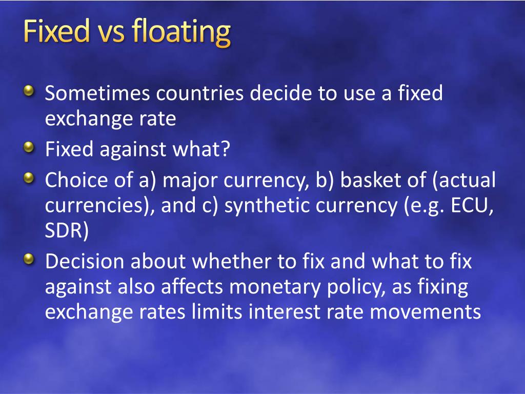 Fixed vs floating • Sometimes countries decide to use a fixed exchange rate • Fixed against what? • Choice of a) major currency, b) basket of (actual currencies), and c) synthetic currency (e.g. ECU, SDR) • Decision about whether to fix and what to fix against also affects monetary policy, as fixing exchange rates limits interest rate movements