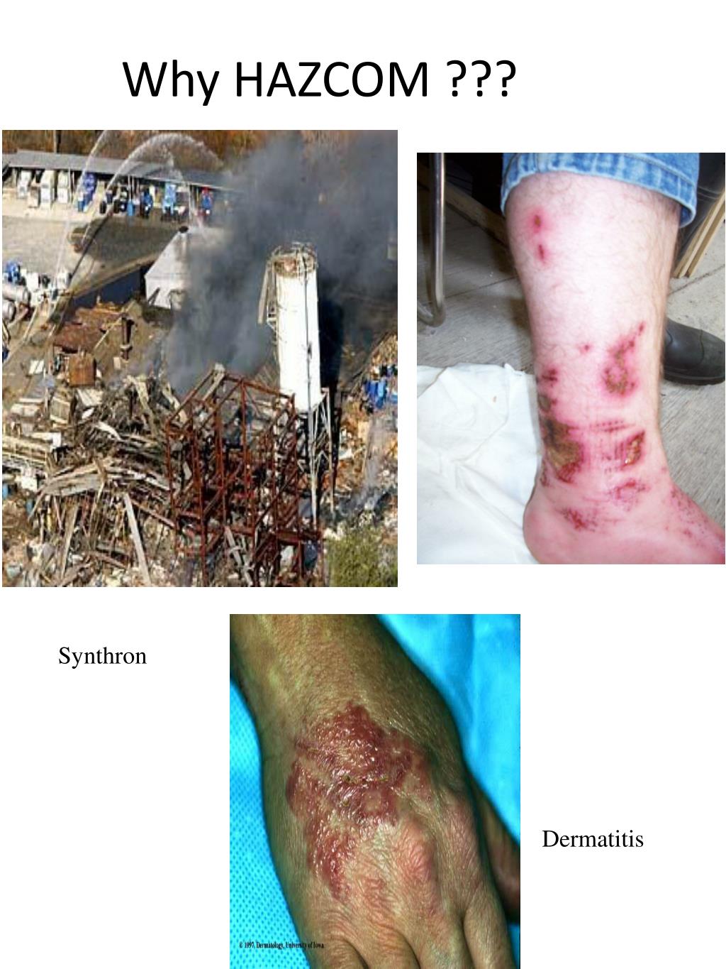 GLOBALLY HARMONIZED. Chemical Safety on the Job. 11-2011. Why HAZCOM ???. Synthron. Dermatitis. Global Harmonization. Adopted 4-26-2012 New MSDS (New name SDS Safety Data Sheet. 1. Standardized format and information 2. 16 Sections