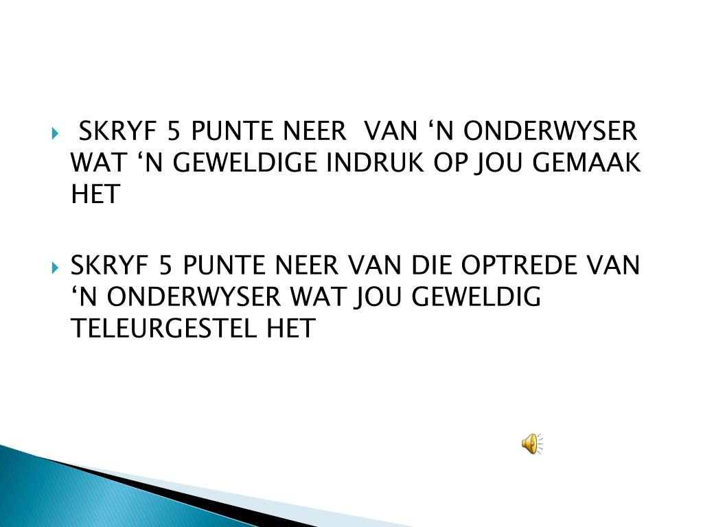 SKRYF 5 PUNTE NEER VAN ‘N ONDERWYSER WAT ‘N GEWELDIGE INDRUK OP JOU GEMAAK HET • SKRYF 5 PUNTE NEER VAN DIE OPTREDE VAN ‘N ONDERWYSER WAT JOU GEWELDIG TELEURGESTEL HET