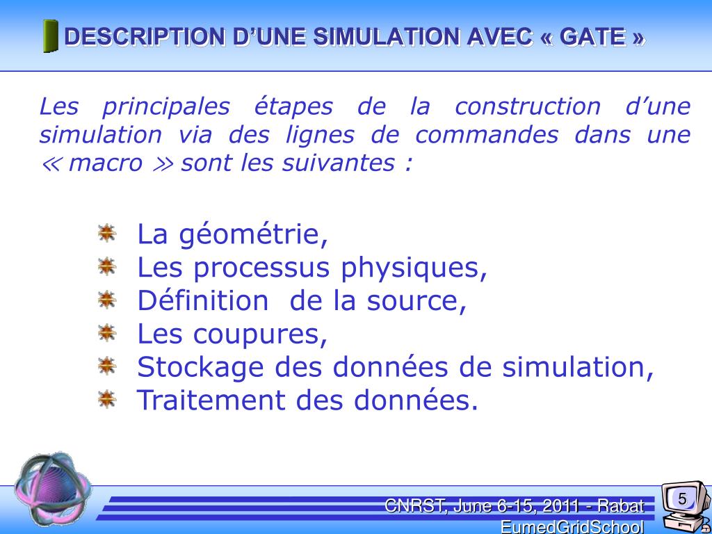 DESCRIPTION D’UNE SIMULATION AVEC « GATE » Les principales étapes de la construction d’une simulation via des lignes de commandes dans une ≪ macro ≫ sont les suivantes : • La géométrie, • Les processus physiques, • Définition de la source, • Les coupures, • Stockage des données de simulation, • Traitement des données. CNRST, June 6-15, 2011 - Rabat EumedGridSchool