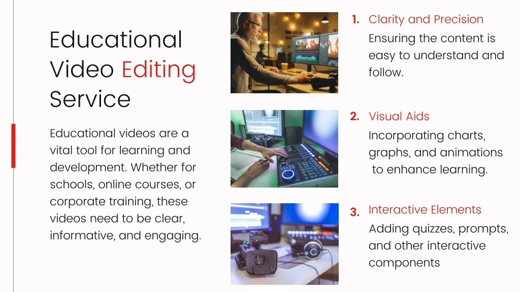 1. Clarity and Precision Ensuring the content is easy to understand and follow. Educational Video Editing Service Educational videos are a vital tool for learning and development. Whether for schools, online courses, or corporate training, these videos need to be clear, informative, and engaging. 2. Visual Aids Incorporating charts, graphs, and animations to enhance learning. Interactive Elements Adding quizzes, prompts, and other interactive components 3.