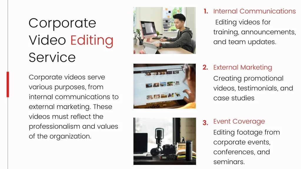 1. Internal Communications Editing videos for training, announcements, and team updates. Corporate Video Editing Service Corporate videos serve various purposes, from internal communications to external marketing. These videos must reflect the professionalism and values of the organization. 2. External Marketing Creating promotional videos, testimonials, and case studies Event Coverage Editing footage from corporate events, conferences, and seminars. 3.