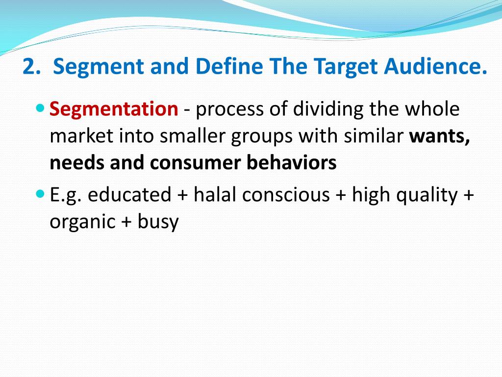2. Segment and Define The Target Audience. • Segmentation - process of dividing the whole market into smaller groups with similar wants, needs and consumer behaviors • E.g. educated + halal conscious + high quality + organic + busy