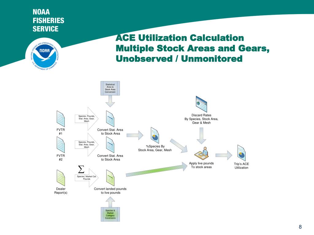 ACE Utilization Calculation • Apply discard rates by species/stock/gear/mesh • Details on calculations provided in Workshop I • Discard Estimation for use in Weekly Sector Catch Reports -- Illustrative examples (posted in WS I web site) • Result is trip’s ACE utilization • Sum all trips for week by species and stock area to create Sector Manager’s Weekly Report