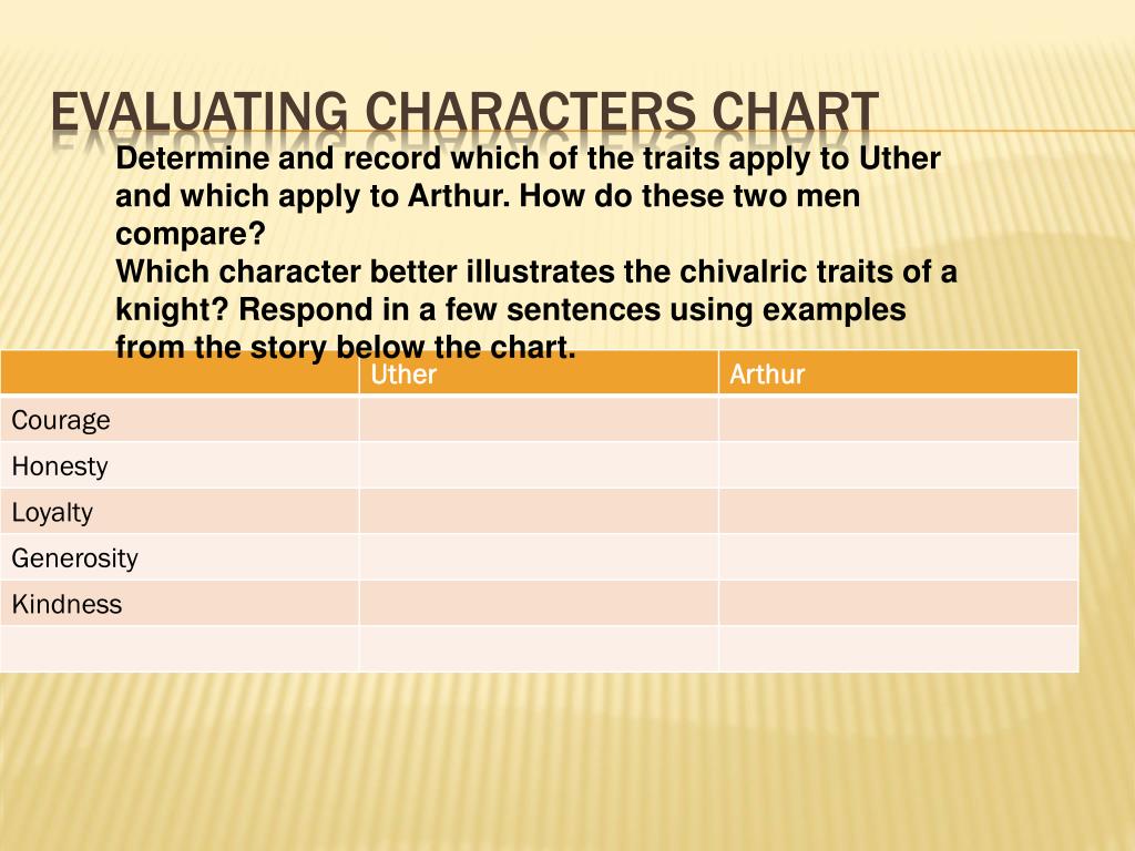 Evaluating Characters Chart Determine and record which of the traits apply to Uther and which apply to Arthur. How do these two men compare? Which character better illustrates the chivalric traits of a knight? Respond in a few sentences using examples from the story below the chart.